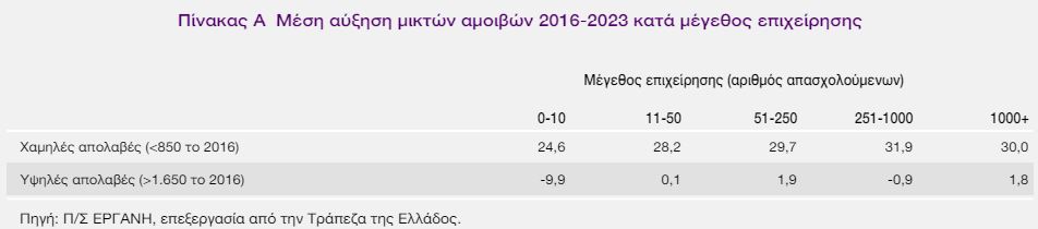 Στις επιχειρήσεις μεγαλύτερου μεγέθους παρατηρείται ότι για τις θέσεις εργασίας με υψηλές απολαβές οι αυξήσεις είναι πολύ μικρές. Συγκεκριμένα, μία θέση εργασίας που αμειβόταν με 1.750 ευρώ το 2016 σε μία εταιρία με πάνω από 1.000 εργαζόμενους, στον ίδιο κλάδο, για το ίδιο επάγγελμα, με τον ίδιο τύπο σύμβασης, με έναν εργαζόμενο στην ίδια ηλικιακή ομάδα, με το ίδιο φύλο, πλήρους απασχόλησης το 2023 αμειβόταν ονομαστικά με 1.781,50 ευρώ κατά μέσο όρο. Σε πραγματικούς όρους, το 2023, λόγω του πληθωρισμού, η αμοιβή ήταν περίπου 1.495 ευρώ (μείωση κατά 16%).