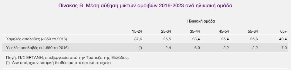 Οι μεταβολές αμοιβών των θέσεων εργασίας με χαμηλές απολαβές είναι πολύ μεγαλύτερες σε σχέση με αυτές των θέσεων εργασίας με υψηλές απολαβές, ανεξάρτητα από την ηλικία των εργαζομένων. Οι αμοιβές των εργαζομένων ηλικίας 15-24 ετών αυξήθηκαν κατά 37,6% την περίοδο 2016-2023, ενώ αντίστοιχα υψηλές είναι και οι αυξήσεις των εργαζομένων ηλικίας άνω των 65 ετών (40,4%).