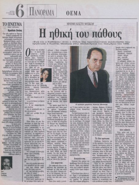 Στο φύλλο των «Νέων» που είχε κυκλοφορήσει τη Δευτέρα 27 Ιουλίου 1998, έναν ακριβώς μήνα μετά το θάνατο του Μοσκώφ, υπήρχε ένα έξοχο κείμενο της Φωτεινής Τσαλίκογλου (συγγραφέως και ομότιμης καθηγήτριας Ψυχολογίας στο Πάντειο Πανεπιστήμιο) αφιερωμένο στη μνήμη του. Σε αυτό διαβάζουμε τα εξής: