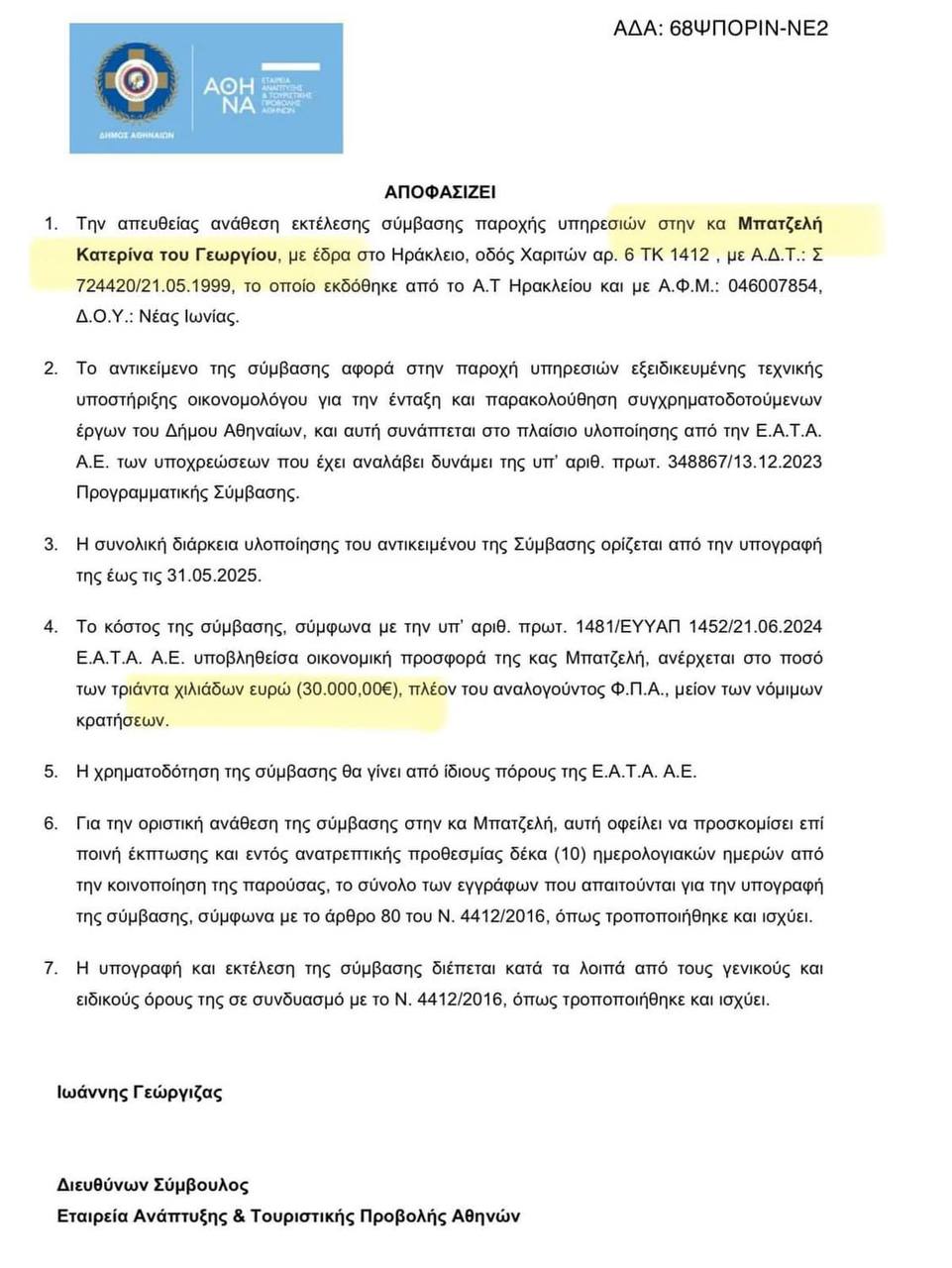 Η επίμαχη απόφαση (όπως είναι αναρτημένη στη Διαύγεια), την οποία υπογράφει ο διευθύνων σύμβουλος της ΕΤΑΙΡΙΑΣ ΑΝΑΠΤΥΞΗΣ ΚΑΙ ΤΟΥΡΙΣΤΙΚΗΣ ΠΡΟΒΟΛΗΣ ΑΘΗΝΩΝ (ΕΑΤΑ) του Δήμου Αθηναίων, προβλέπει την απευθείας ανάθεση εκτέλεσης σύμβασης παροχής υπηρεσιών στην κ. Μπατζελη Κατερίνα. Η παροχή των υπηρεσιών αφορά το διάστημα έως το Μάιο του 2025.