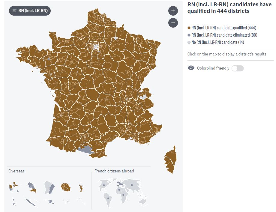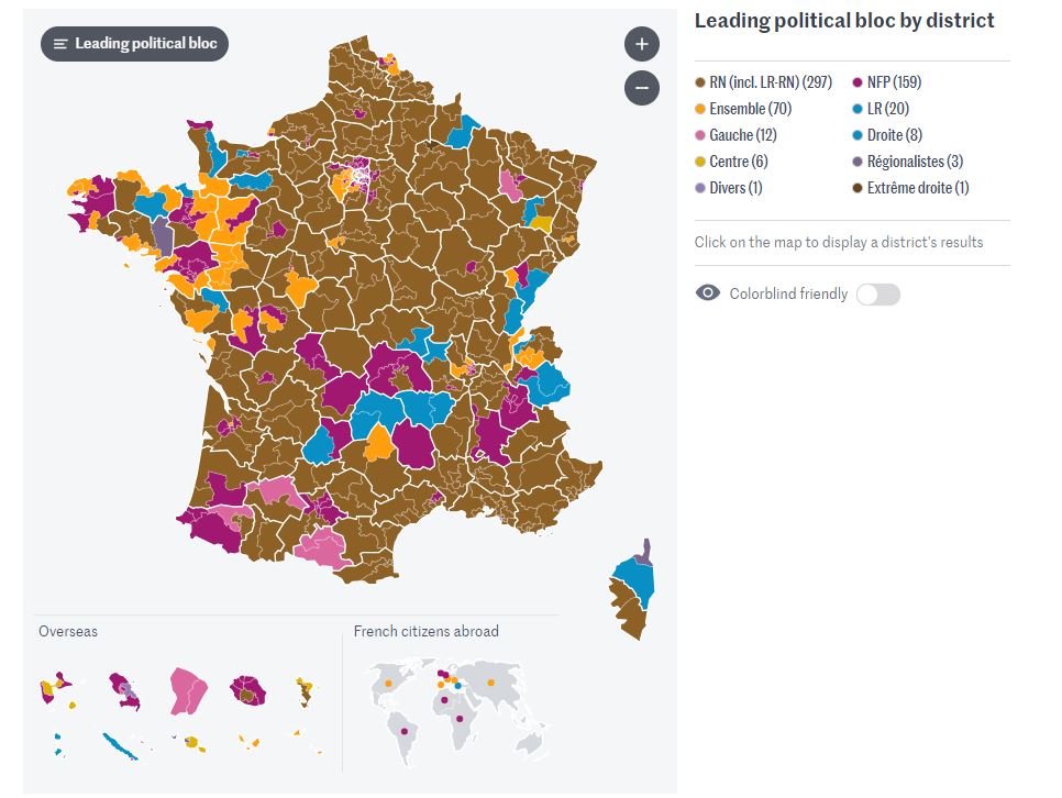 Ο χάρτης που ακολουθεί δείχνει με καφέ χρώμα το κόμμα Λεπέν, να έρχεται πρώτο σε 297 (από τις 577) περιφέρειας της Γαλλίας, ενώ ακολουθεί το Ενωμένο Λαϊκό Μέτωπο της αριστεράς με πρωτιά σε 159 περιφέρειες και το προεδρικό «Μαζί» του Μακρόν που αναδείχθηκε πρώτο μόνο σε 70 περιφέρειες.