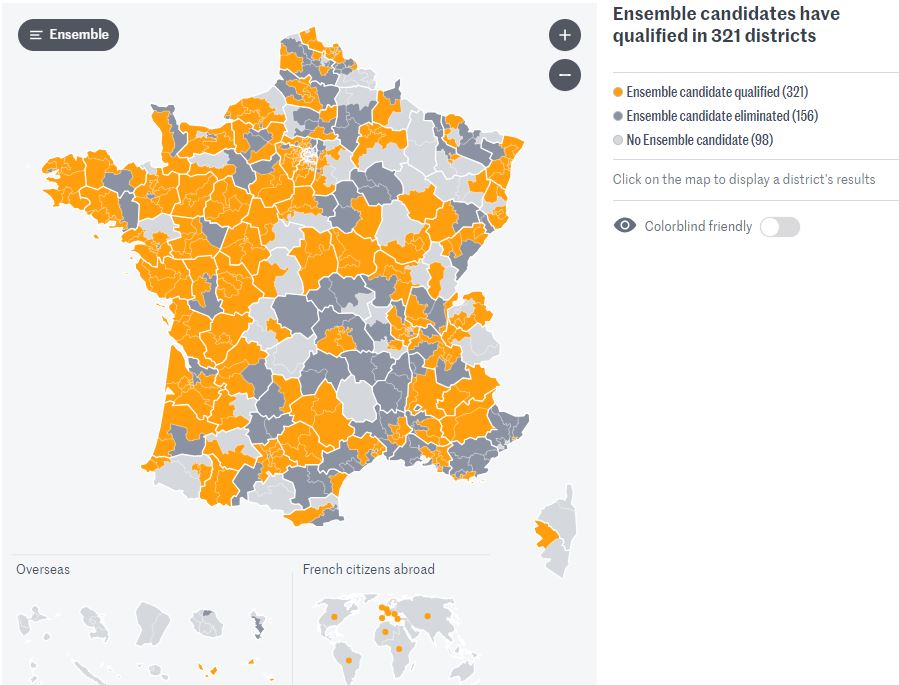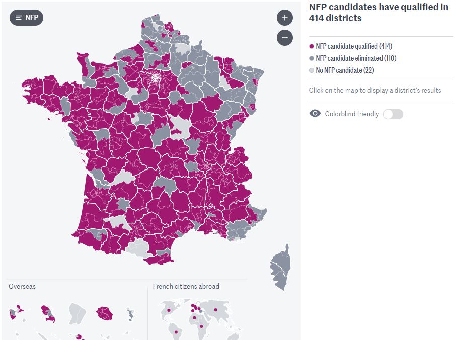 Αντίστοιχα, στο χάρτη που ακολουθεί φαίνεται ότι το αριστερό Ενωμένο Λαϊκό Μέτωπο (NFP) έχει προκριθεί σε 414 περιφέρειες.
