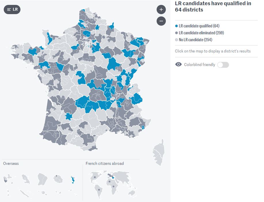 Και τέλος, το κόμμα των Ρεπουμπλικάνων (LR) έχει προκριθεί σε 64 περιφέρειες.