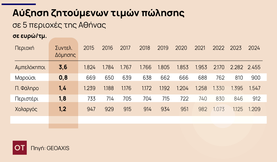 Η μικρότερη άνοδος καταγράφεται στο Περιστέρι (24,42%, από 7733 ευρώ σε 912 ευρώ) με Σ.Δ. 1,8 και το Χολαργό με συντελεστή δόμησης 1,2.