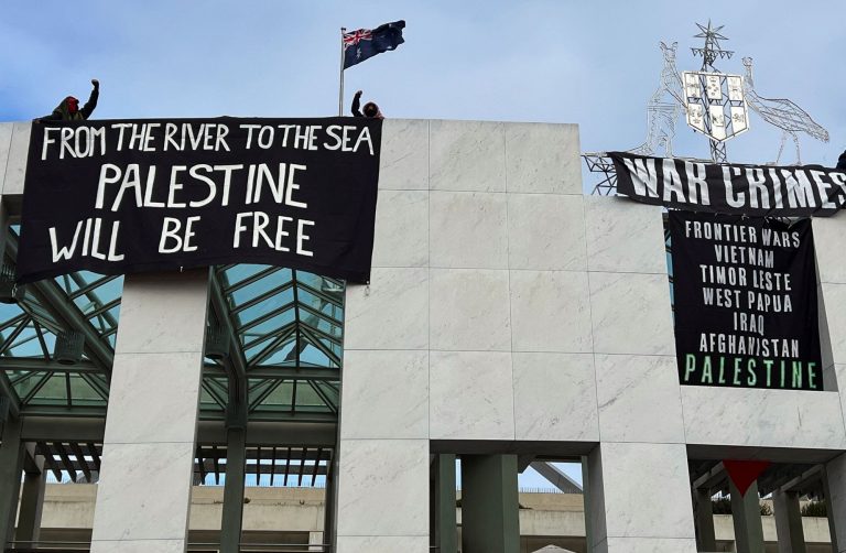 Διαδηλωτές υπέρ της Παλαιστίνης ανέβηκαν την Πέμπτη στην οροφή του κοινοβουλίου της Αυστραλίας στην Καμπέρα και ξεδίπλωσαν πανό, ένα από τα οποία έγραφε «Η Παλαιστίνη θα είναι ελεύθερη» και κατηγόρησαν το Ισραήλ για εγκλήματα πολέμου, όπως έδειξαν τηλεοπτικά πλάνα.
