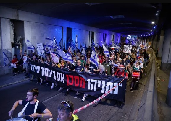 Περίπου 2.000 αντικυβερνητικοί διαδηλωτές πραγματοποίησαν πορεία από το Ανώτατο Δικαστήριο της Ιερουσαλήμ προς την οικία του πρωθυπουργού Μπενιαμίν Νετανιάχου στην οδό Άζα στο κέντρο της πόλης την Πέμπτη.