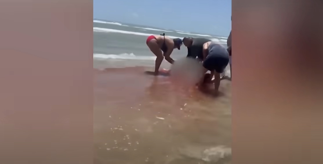 Το βίντεο που κοινοποιήθηκε στην πλατφόρμα κοινωνικής δικτύωσης X(πρώην Twitter) δείχνει το θαλασσινό νερό κοντά στην παραλία να γίνεται κόκκινο καθώς το αίμα αναβλύζει από την πληγή του θύματος.