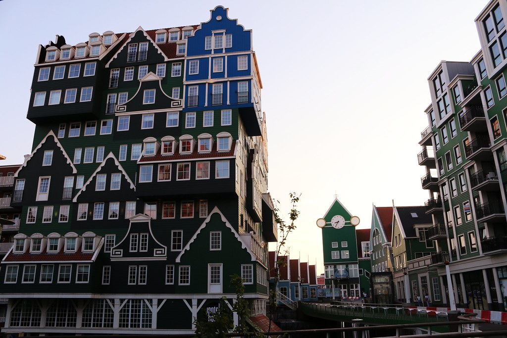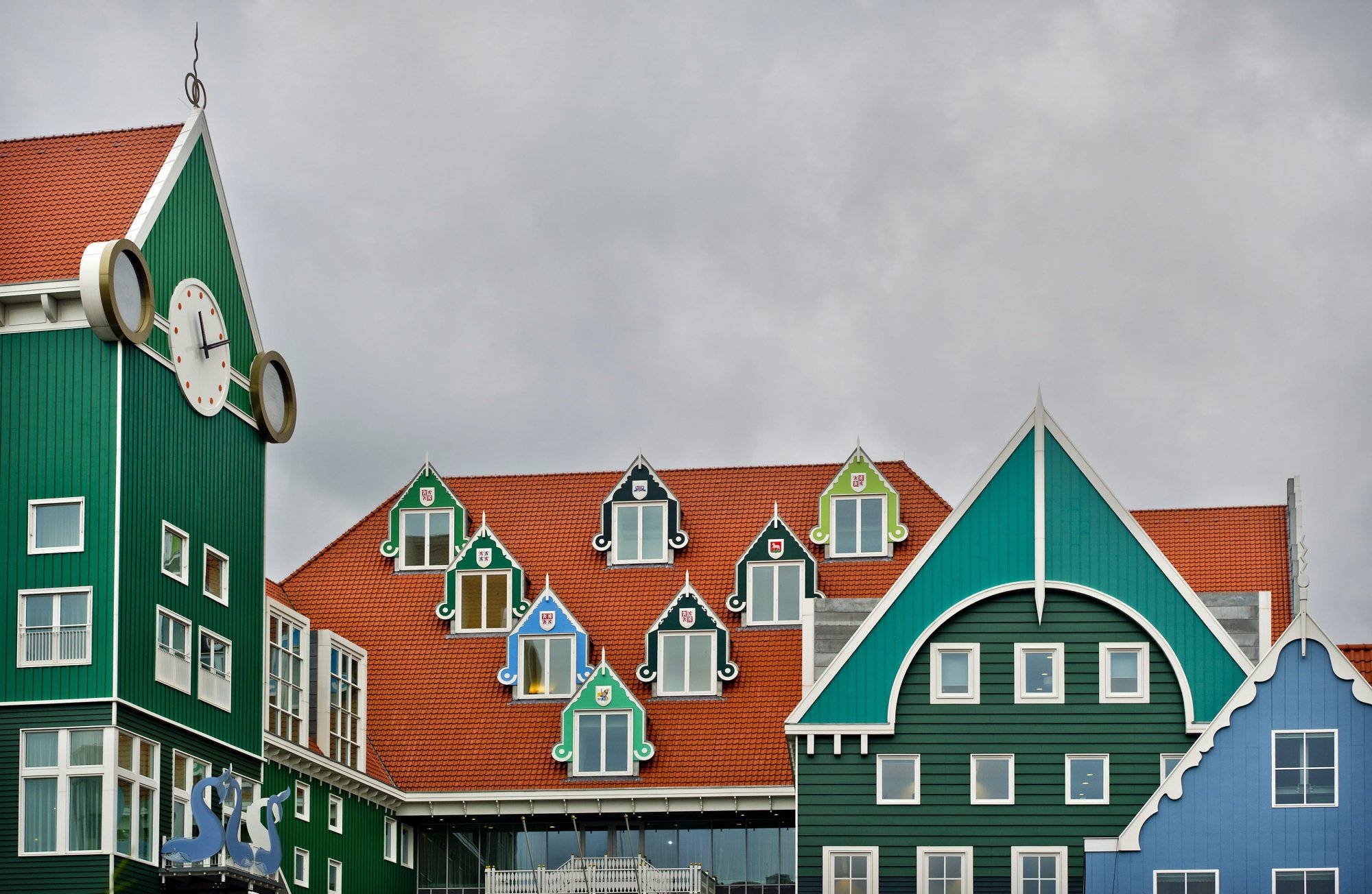 Τα πολύχρωμα ολλανδικά σπίτια διαθέτουν ξύλινη πρόσοψη και λευκά πλαίσια παραθύρων. Μοιάζουν σαν να έχουν στοιβαχτεί το ένα πάνω στο άλλο, δίνοντάς τους μια εμφάνιση σαν Lego.