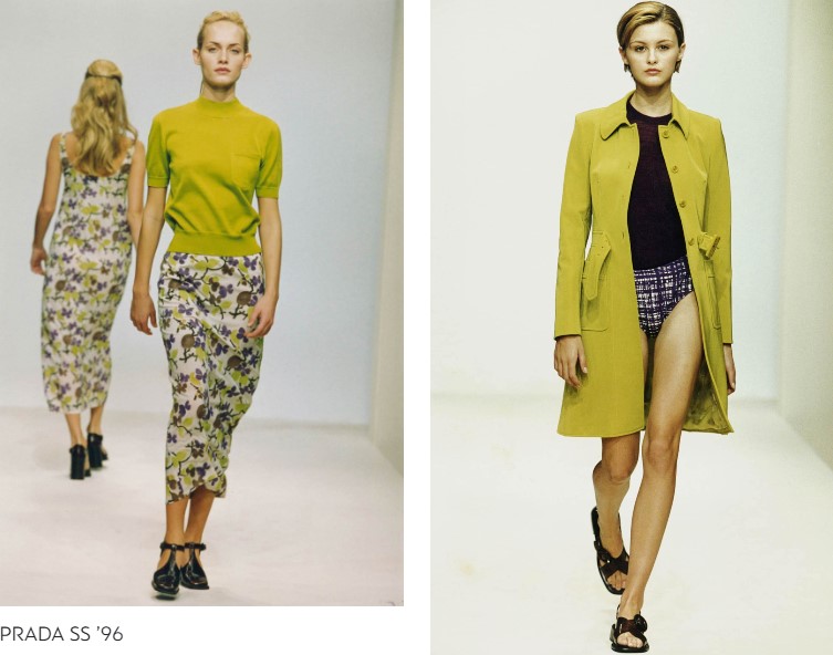 Η Miuccia Prada η μητέρα των anti-trends ακολούθησε την ίδια προσέγγιση στην συλλογή της για την άνοιξη του 1996 με τίτλο «Ugly Chic», η οποία περιλαμβάνει pencil φούστες, μπλούζες με κουμπιά και καρό παντελόνια σε ένα σκοτεινό καφέ-πράσινο χρώμα που αργότερα ονομάστηκε Miuccia sludge. Το σόου της ήταν ένα αντίβαρο στα φορέματα Gucci του Tom Ford της εποχής και στα γυμνά φορέματα που έστειλε στην πασαρέλα ο John Galliano για τον Dior. «Η φιλοσοφία της Prada πίσω από αυτή τη συλλογή ήταν να ανατρέψει την ιδέα του «κακού γούστου» μέσω της μόδας και να δείξει πόσο σημαντική είναι η μόδα για τον πολιτισμό συνολικά», λέει η συγγραφέας μόδας Viv Chen. «Το πράσινο της λάσπης, το πράσινο της γλίτσας -όπως θέλετε να το ονομάσετε- έγινε τότε ένα χρώμα που συνδέθηκε για πάντα με την ιδέα των anti-trends μέσα στη μόδα.