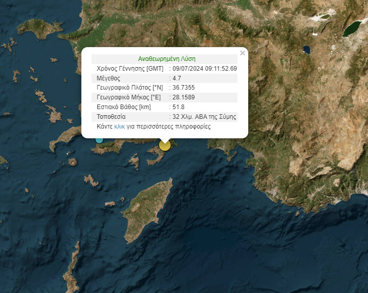 Σύμφωνα με την αναθεωρημένη λύση του Γεωδυναμικού Ινστιτούτου, το επίκεντρο του σεισμού, που έχει εστιακό βάθος 51,8 χλμ., είναι κοντά στα τουρκικά παράλια και συγκεκριμένα 32 χλμ. ανατολικά βορειοανατολικά της Σύμης.