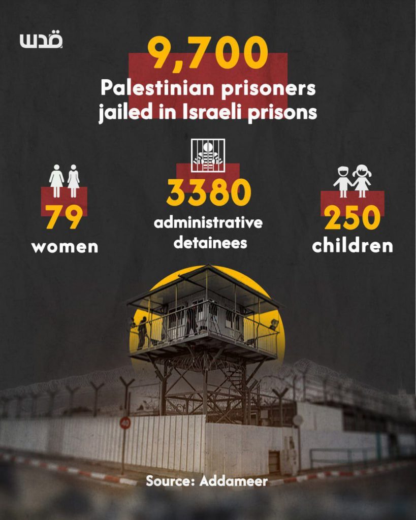 Η Παλαιστινιακή Εταιρεία Κρατουμένων αναφέρει ότι περισσότεροι από 9.600 Παλαιστίνιοι από την κατεχόμενη Δυτική Όχθη και την Ανατολική Ιερουσαλήμ κρατούνται σήμερα σε ισραηλινές φυλακές.