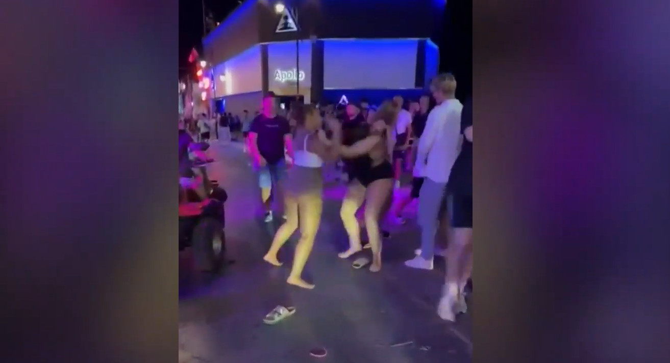 Οι τουρίστριες, οι οποίες είναι πιθανότατα Βρετανίδες και ήρθαν στα Μάλια για να περάσουν λίγες μέρες ξεγνοιασιάς, έπειτα από ξενύχτι και προφανώς υπό την επήρεια αλκοόλ άρχισαν ξαφνικά να διαπληκτίζονται στη μέση του δρόμου.
