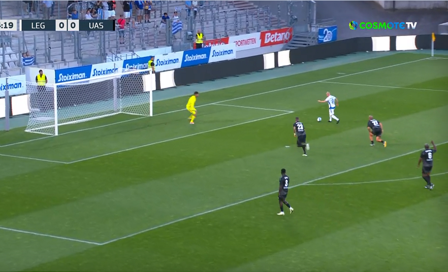 Ο Γιώργος Καραγκούνης έδωσε την διαγώνια ασίστ και έβγαλε σε θέση βολής τον παλαίμαχο ποδοσφαιριστή του Ολυμπιακού που πλάσαρε εύστοχα τον Ντέιβιντ Τζέιμς.