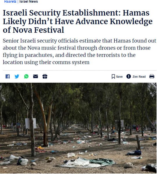 Ειδικότερα η Haaretz, επικαλούμενη αστυνομικές πηγές, σε άρθρο της στις 18/11/23 αποκάλυψε ότι στον χώρο του μουσικού φεστιβάλ Supernova, «ένα μαχητικό ελικόπτερο των IDF που έφτασε στη σκηνή και πυροβόλησε τρομοκράτες εκεί, προφανώς χτύπησε και αρκετούς συμμετέχοντες στο φεστιβάλ».