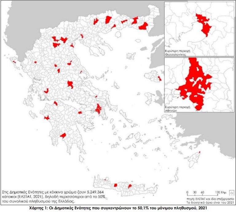 2,1 εκατομμύρια κάτοικοι στις Περιφερειακές Ενότητες Θεσσαλονίκης και Κεντρικού Τομέα Αθηνών που καταλαμβάνουν μόλις το 2,8% της έκτασης της Ελλάδας