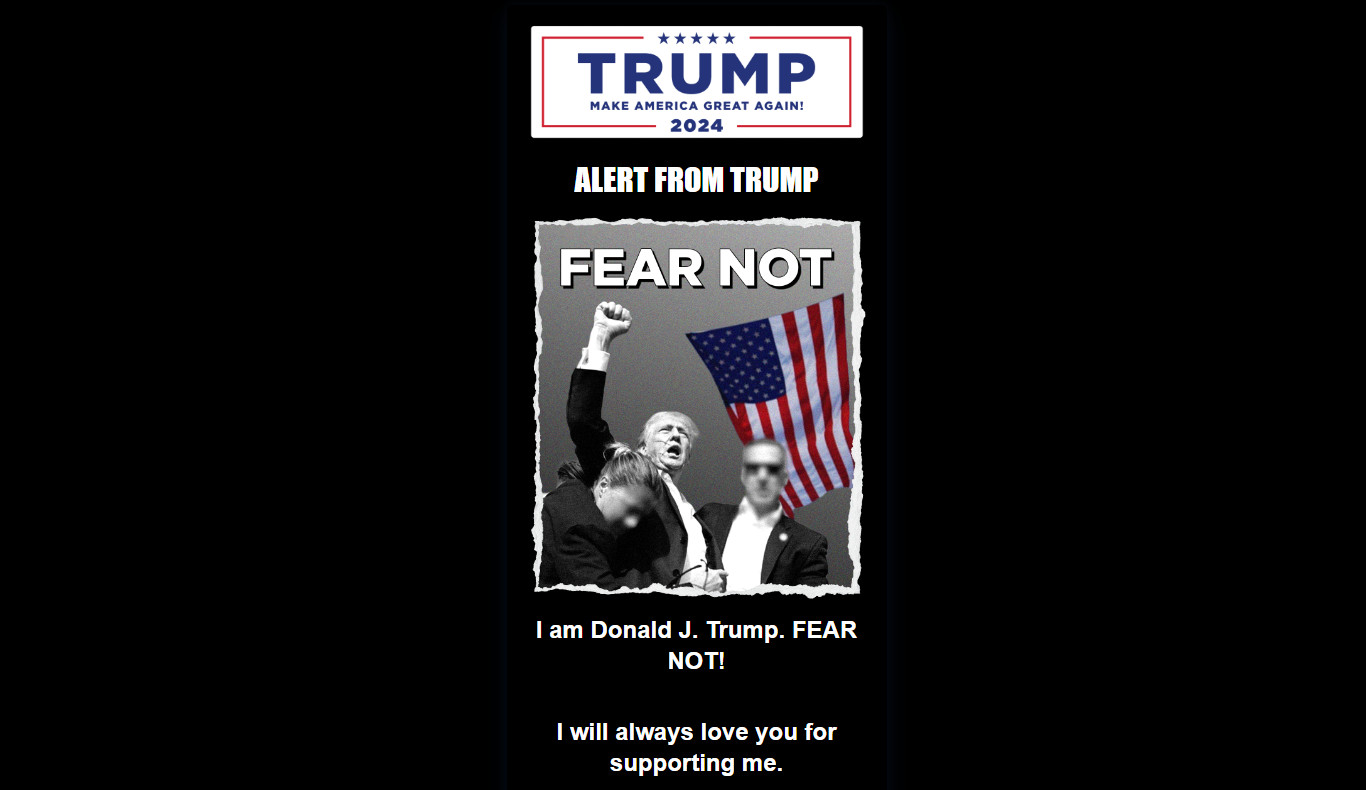 Ένα μήνυμα κάτω από την εικόνα λέει: «Ενότητα. Ειρήνη. Κάντε την Αμερική Μεγάλη Ξανά». Η σελίδα φέρει επίσης την υπογραφή του Τραμπ και δίνει στους επισκέπτες του ιστοτόπου επιλογές να κάνουν δωρεά διαφόρων ποσών.