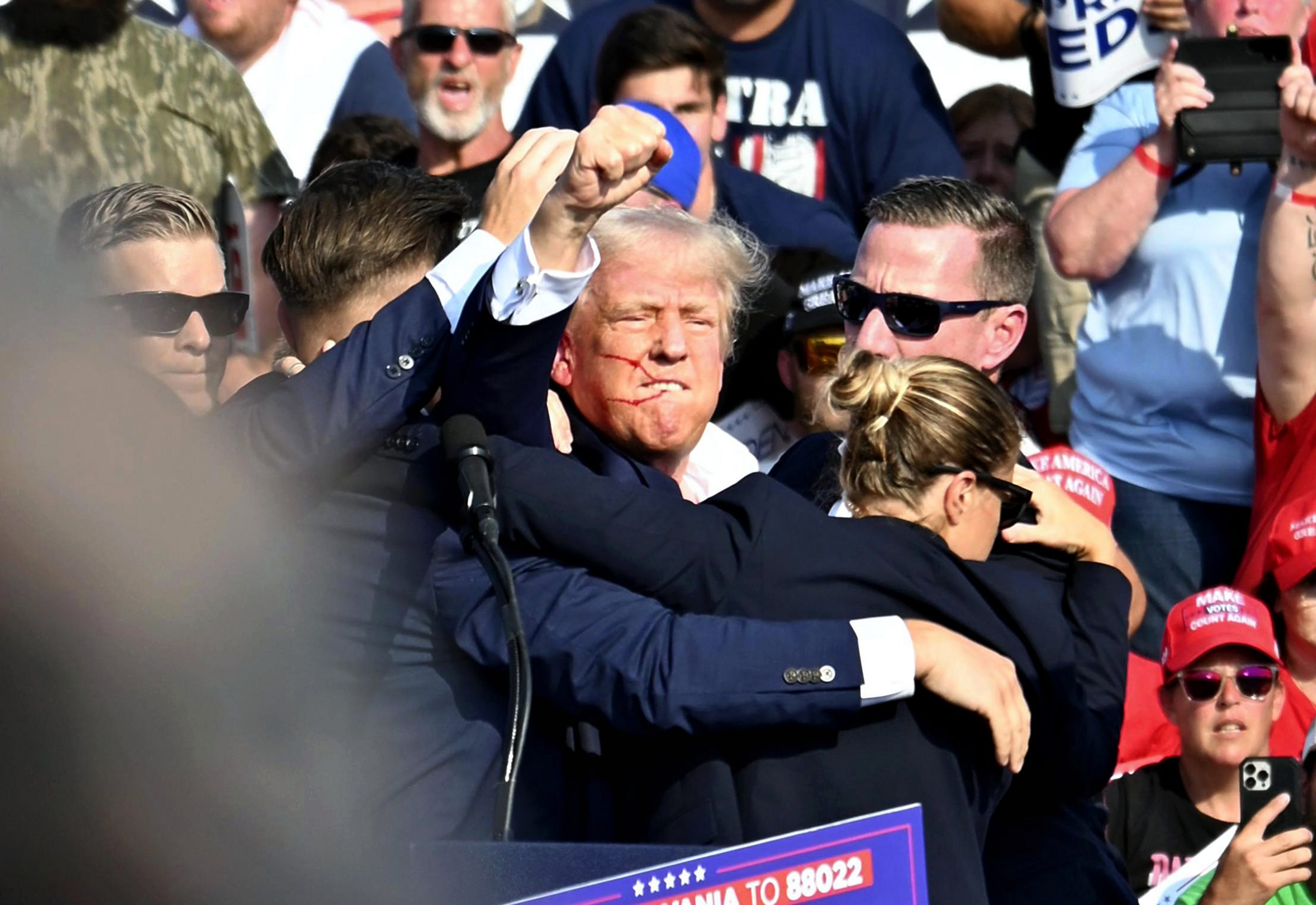 Για να βλέπει καλύτερα την οθόνη, ο Τραμπ έστρεψε το κεφάλι του προς τα δεξιά και λίγο προς τα πάνω, και στο χιλιοστό του δευτερολέπτου κατά το οποίο το κεφάλι του βρισκόταν ακριβώς στη σωστή γωνία, ώστε η σφαίρα να ακουμπήσει το αυτί του, αλλά να μην εισέλθει στο κρανίο του – εκείνη τη στιγμή, η σφαίρα πέρασε ξυστά. Ο Τραμπ υπέστη τραυματίστηκε στο αυτί του, αλλά όχι σε άλλο σημείο. Φαινόταν σαν θαύμα.