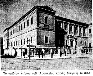 Έτσι, με τα ολίγα αυτά μέσα, αλλά με σημαίαν την πίστιν και τον ενθουσιασμόν, ιδρύθη το πρώτον σχολείον της εταιρείας εις την οικίαν Βιτάλη παρά την οδόν Ερμού, που δεν σώζεται πλέον, και το 1837 ήρχισαν τα μαθήματα. Το πρώτο αυτό σχολείον των Ελληνίδων υπήρξεν η ωραία αφετηρία που επύργωσε τον ενθουσιασμόν και υπέκαυσε την εθνικήν φιλοτιμίαν και των δωρητών αλλά και των εγγραφομένων μαθητριών. Το 1841 ιδρύεται νέον κτίριον διά την στέγασιν των σχολείων της Φιλεκπαιδευτικής Εταιρείας. Και το 1842 ηγοράσθη από την εν Άνδρω μονήν της Ζωοδόχου Πηγής το γήπεδον της οδού Σταδίου, επί του οποίου ευρίσκεται σήμερον το Αρσάκειον. Έλληνες της Ρουμανίας προσέφεραν την ξυλείαν διά το κτίριον, άλλοι ομογενείς του εξωτερικού έστελναν από τις πλέον απομακρυσμένες χώρες την μεγάλην ή την μικράν συνδρομήν των και ο Απόστολος Αρσάκης ανελάμβανε τέλος την όλην δαπάνην και προικοδότησιν του σχολείου, εις το οποίον εδόθη και το όνομα του μεγάλου δωρητού.