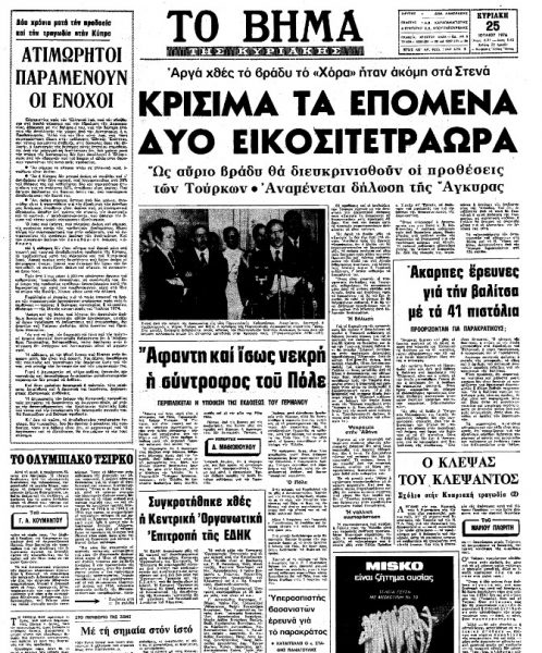 Το κατάλαβαν όταν ήταν αργά πια. Αλλά, έτσι κι αλλιώς, ήταν πολύ αργά. Γιατί η δικτατορία βρέθηκε ολότελα απαράσκευη και για βοήθεια στην Κύπρο και για πόλεμο με την Τουρκία (οι μαρτυρίες τής τότε στρατιωτικής ηγεσίας το βεβαιώνουν απόλυτα). Μαγνητισμένη απ΄τη «συμφωνία», η χούντα είχε παραμείνει σε μακάρια νάρκη, πιστεύοντας αυτάρεσκα πως όλα «θα πάνε ρολόι», ενώ η μικρόνοιά της δεν την άφηνε ούτε τις συνέπειες των πράξεών της να σταθμίσει, ούτε τις ολοφάνερες προθέσεις των άλλων να εκτιμήσει.