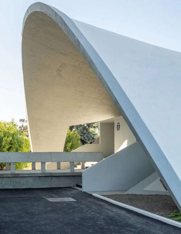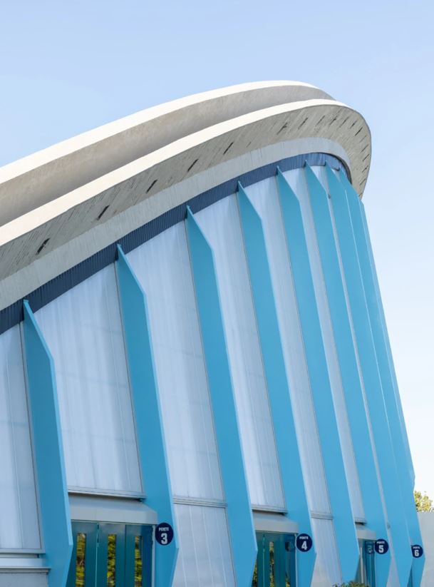 Ενώ το κτίριο φαίνεται να είναι κατασκευασμένο εξ ολοκλήρου από σκυρόδεμα, στην πραγματικότητα υποστηρίζεται μόνο από δύο τσιμεντένιες καμάρες, μεταξύ των οποίων εκτείνονται χαλύβδινα καλώδια, όλα συγκρατώντας τη λεπτή μεταλλική οροφή ψηλά (ενισχυμένη από στύλους πρόσοψης) σε τάση.
