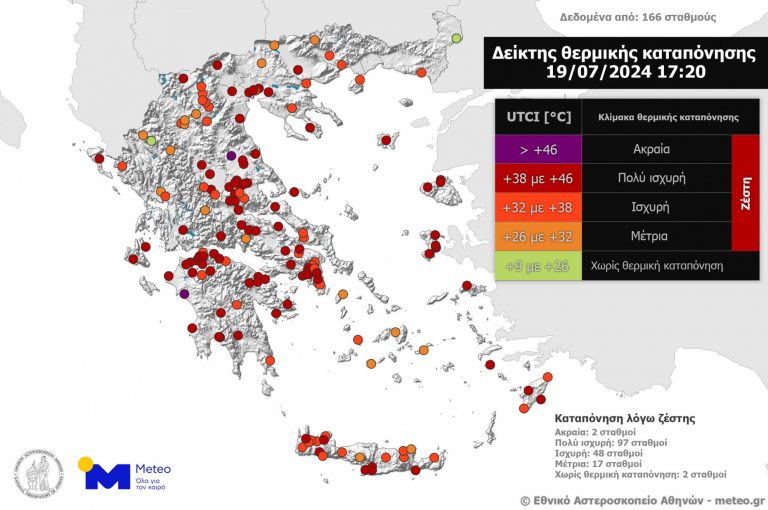 «Πολύ ισχυρή» ήταν η θερμική καταπόνηση του πληθυσμού σε μεγάλο μέρος της χώρας το απόγευμα της Παρασκευής (19/07). Όπως προκύπτει από τις καταγραφές των σταθμών του δικτύου του meteo.gr / Εθνικού Αστεροσκοπείου Αθηνών σε 97 περιοχές η θερμική καταπόνηση ήταν «πολύ ισχυρή» ενώ σε δύο ήταν «ακραία».