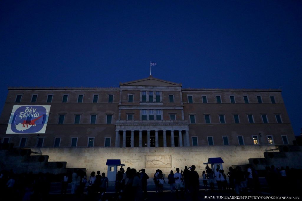 Η Βουλή των Ελλήνων φωταγωγήθηκε με το «Δεν Ξεχνώ» που εικονοποιεί την τραγωδία της Κύπρου.