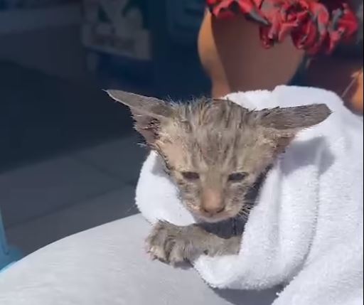 Επόμενη σκηνή το γατίνι που είναι μούσκεμα, τυλιγμένο με μια άσπρη πετσέτα από την οποία εξέχουν τα δυσανάλογα μεγάλα με το προσωπάκι του αυτιά, όπως σε όλα τα μωρά γατιά, και αρχίζει να συνέρχεται πάνω στην αγκαλιά της κοπέλας.