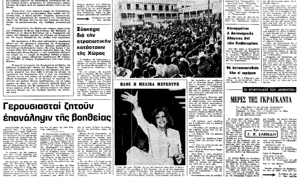 Δεν ξέρω ποια δοκιμασία ήταν η πιο δυσβάσταχτη: τα εφτά χρόνια από την 21η Απριλίου 1967 ή οι εφτά μήνες από την 25η Νοεμβρίου 1973 (σ.σ. τότε καταλύθηκε, κατόπιν αιφνιδιαστικής επεμβάσεως των Ενόπλων Δυνάμεων, το καθεστώς του Γεωργίου Παπαδόπουλου και καταργήθηκε η βραχύβια κυβέρνηση του Σπύρου Μαρκεζίνη); Εκείνο που ξέρω είναι πως η επτάωρη εκτόνωση του συσσωρευμένου άγχους και φόβου, της απανωτής ταπείνωσης και οργής, από το βραδάκι της 23ης Ιουλίου ως τις πρώτες ώρες της 24ης έδειξε θαυμαστή την πολιτική ωριμότητα του λαού.