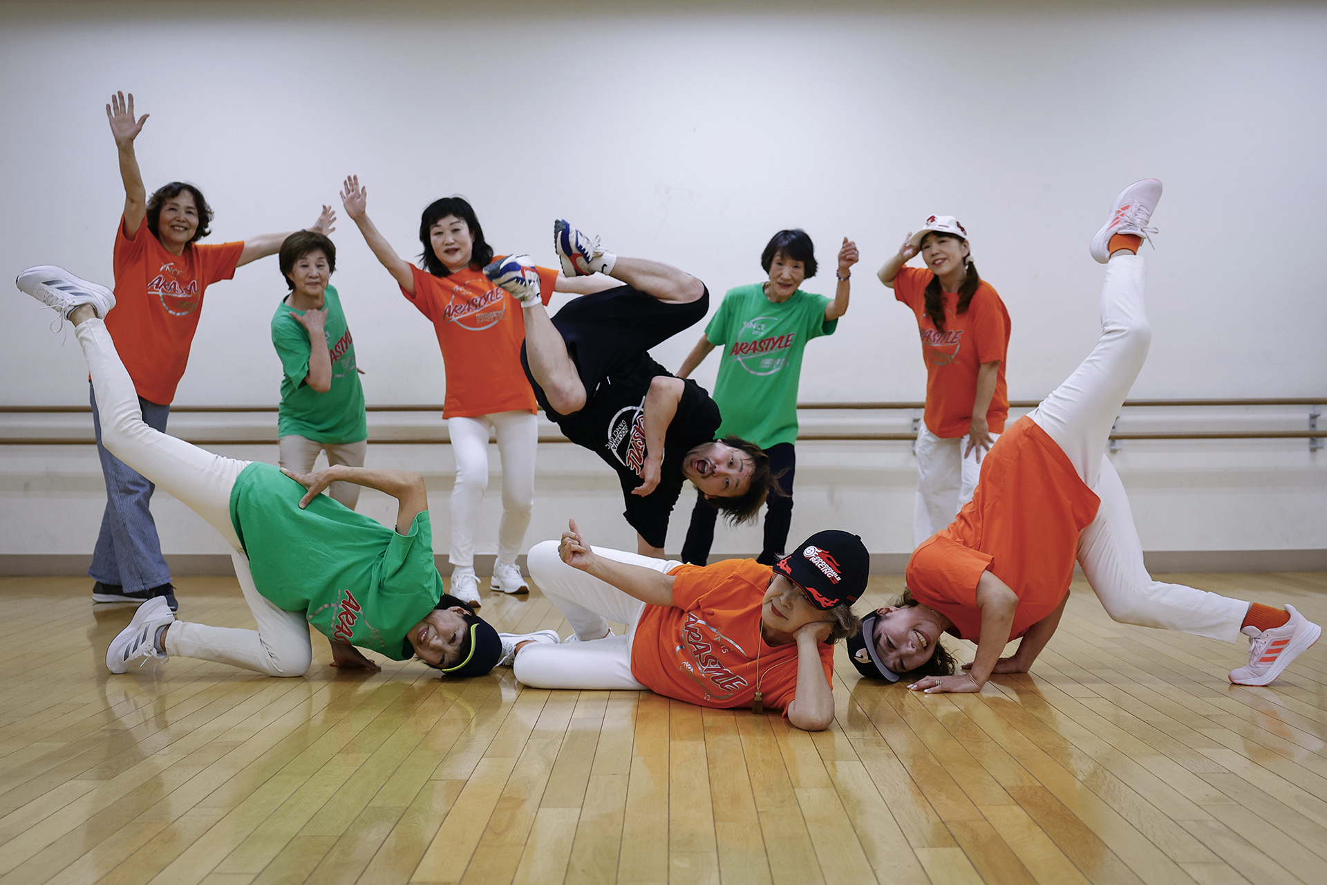 Τα 10 άτομα – που φορούν φωτεινά πορτοκαλί και πράσινα μπλουζάκια που τους ξεχωρίζουν ως μέλη της ομάδας Ara Style Senior – δεν ανήκουν στη δημογραφική ομάδα που συνήθως συνδέετε με το breakdancing. Ο μέσος όρος ηλικίας τους κυμαίνεται λίγο κάτω από τα 70, και ο μεγαλύτερος είναι 74 ετών.