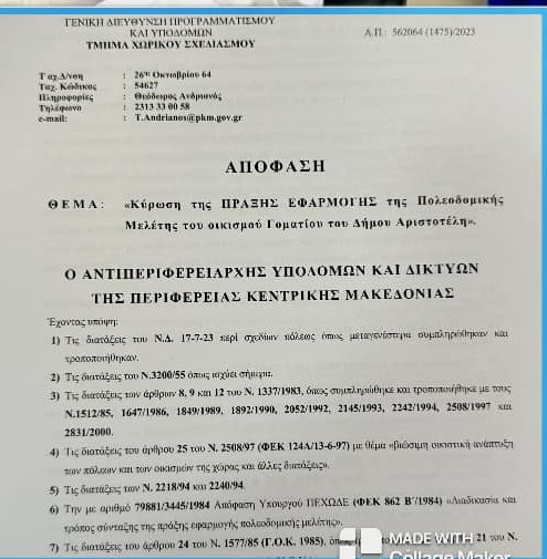 Μετά από προσπάθειες ετών εκδόθηκε η πράξη εφαρμογής της πολεοδομικής μελέτης για τον οικισμό Γοματίου του Δήμου Αριστοτέλη. Με την πράξη εφαρμογής, πρακτικά ο οικισμός επεκτείνεται κατά 140 νέα οικόπεδα, που θα μπορούσαν να αποτελέσουν προορισμό επένδυσης και κατοικίας για ανθρώπους που θέλουν να μείνουν στην περιοχή αποκτώντας τη δική τους κατοικία αλλά και όσους βλέπουν μια ευκαιρία τουριστικής επένδυσης , μιας και το Γομάτι με το ορεινό ύφος βρίσκεται σε απόσταση αναπνοής από τη θάλασσα.