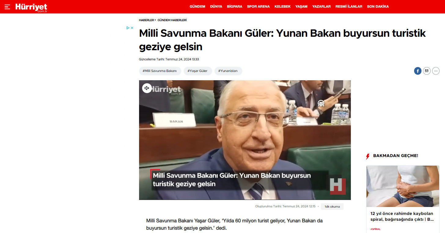 Ο Γκιουλέρ μάλιστα επέλεξε να είναι ιδιαίτερα σκωπτικός απαντώντας στον Γεωργιάδη λέγοντας πως «60 εκατομμύρια τουρίστες έρχονται κάθε χρόνο, ο Έλληνας υπουργός είναι ευπρόσδεκτος να έρθει για τουρισμό».