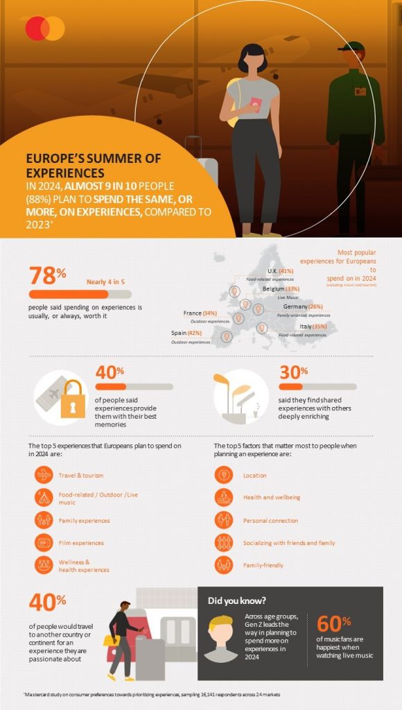 Εννέα στους δέκα ταξιδιώτες (ποσοστό 88%) θα ξοδέψουν τα ίδια ή περισσότερα χρήματα για εμπειρίες το 2024 σε σύγκριση με το 2023. Αυτό προκύπτει από έρευνα της Mastercard, που εξετάζει τους λόγους για τους οποίους οι ταξιδιώτες προτιμούν να δαπανούν χρήματα σε εμπειρίες, ιδίως σε μια χρονιά γεμάτη από παγκόσμιες αθλητικές διοργανώσεις, περιοδείες μουσικών καλλιτεχνών και διεθνή φεστιβάλ κινηματογράφου στην Ευρώπη.