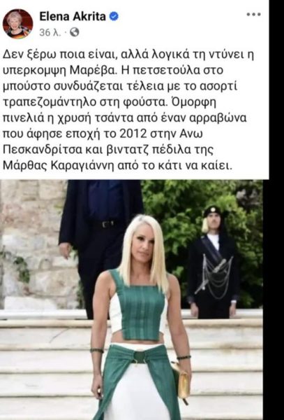 «Η βουλευτής Επικρατείας του ΣΥΡΙΖΑ Έλενα Ακρίτα επιτίθεται με χυδαίο τρόπο σε γυναίκα δημοσιογράφο για τις ενδυματολογικές της επιλογές. Υπαινίσσεται δε το ανήκουστο: ότι η αντικειμενικότητα και η αξιοπιστία της δημοσιογράφου, συνδέονται με κάποιο τρόπο με τα ρούχα που φοράει! Είναι αδιανόητο να εκφράζονται τέτοιες απόψεις από μια βουλευτή Επικρατείας και θεωρώ αυτονόητη την καταδίκη τέτοιων απόψεων από σύσσωμο τον πολιτικό και τον δημοσιογραφικό κόσμο. Οι συγγνώμες δεν μπορούν να καλύψουν το δόγμα του «πολακισμού» που έχει κυριεύσει τον ΣΥΡΙΖΑ. Κυρία Ακρίτα είστε σίγουρα Αναπληρώτρια Τομεάρχης Δικαιοσύνης του ΣΥΡΙΖΑ, αρμόδια για τα δικαιώματα και την ισότητα;»