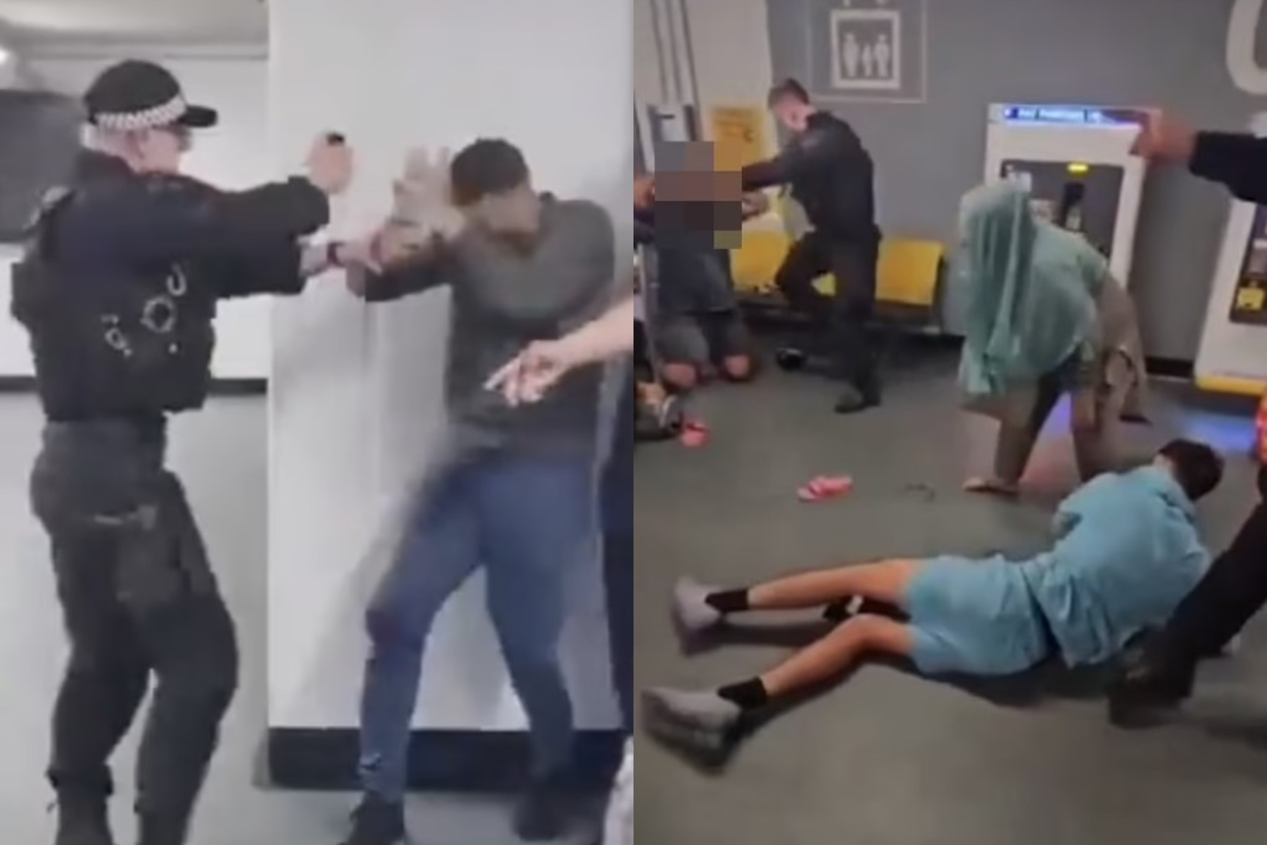 Λίγο πιο πίσω, σε καθίσματα αναμονής, βρίσκεται ένας άλλος άνδρας – χρήστες των social media αναφέρουν ότι είναι αδελφός του πρώτου- με τα χέρια ανασηκωμένα στον αέρα, ο οποίος στη θέα του βίαιου σκηνικού φωνάζει στον αστυνομικό.
