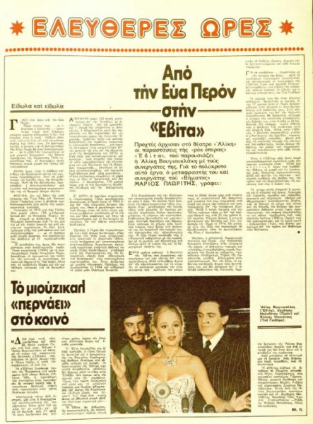 *Κείμενο του Μάριου Πλωρίτη για τη θρυλική Εβίτα, που είχε δημοσιευτεί στην εφημερίδα «Το Βήμα» την Κυριακή 13 Δεκεμβρίου 1981, με αφορμή το ανέβασμα του μιούζικαλ (ροκ όπερας) «Εβίτα» από την Αλίκη Βουγιουκλάκη και τους συνεργάτες της.
