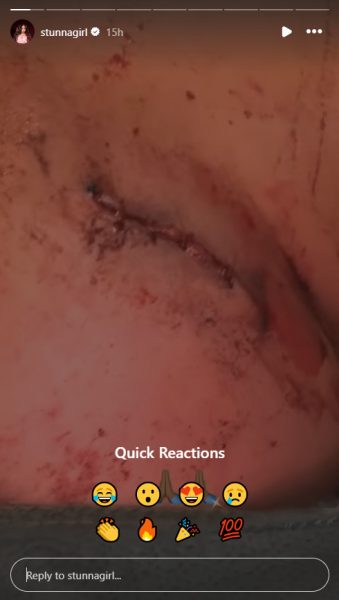 H ράπερ μοιράστηκε ένα βίντεο από το τραύμα της, σημειώνοντας πως η σφαίρα τη χτύπησε πάνω από το στήθος και βγήκε από τη μασχάλη της.