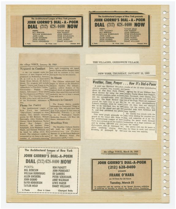 Αυτή η ανακοίνωση δημόσιας υπηρεσίας, η οποία εισήγαγε το Dial-A-Poem όταν παρουσιάστηκε στο MoMA, το Μουσείο Μοντέρνας Τέχνης της Νέας Υόρκης, το 1970, στο πλαίσιο της έκθεσης-ορόσημο Information, αποτυπώνει τη φιλοδοξία του πρωτοποριακού έργου του John Giorno.