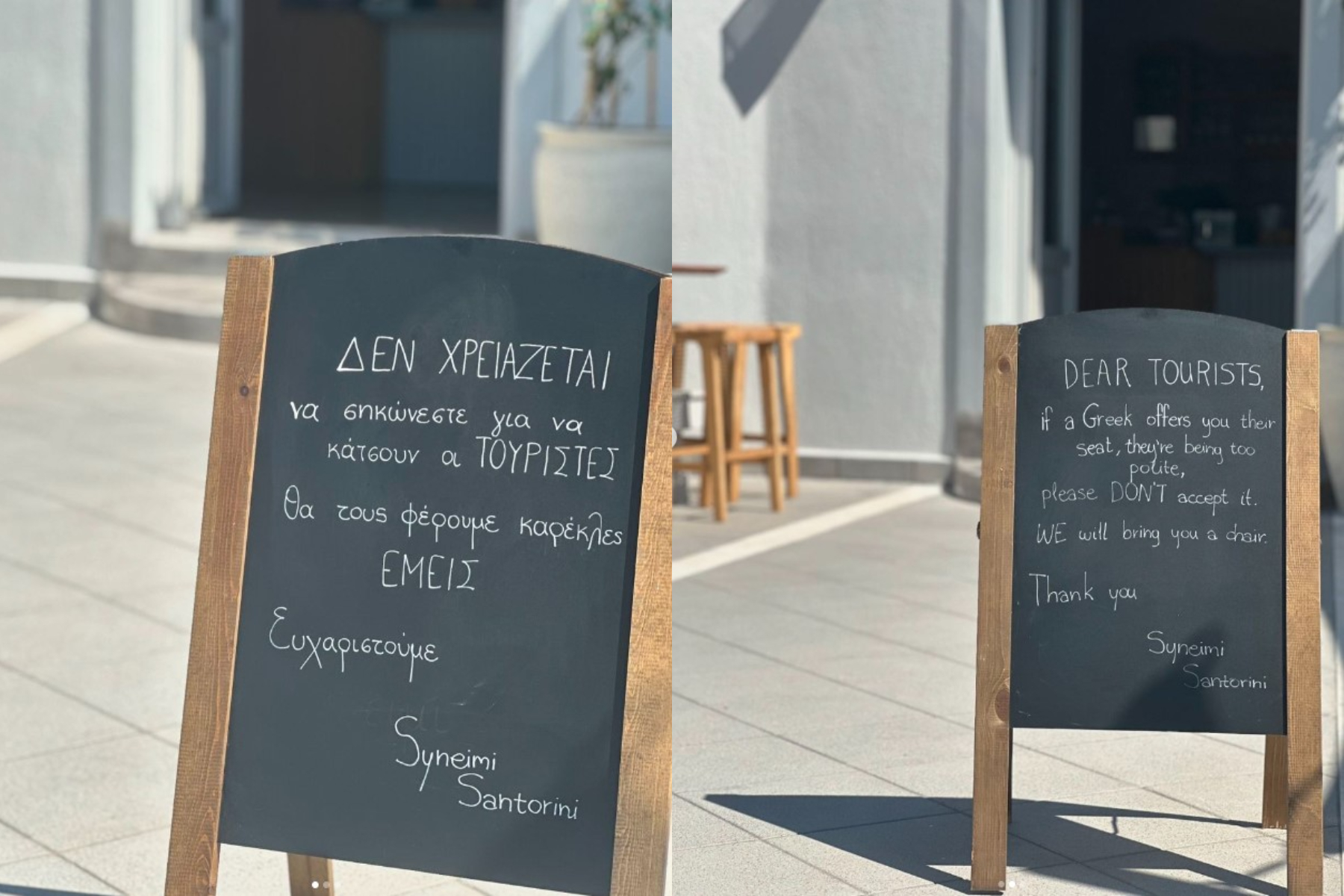 Με φόντο όλα τα παραπάνω, ένα μαγαζί στη Σαντορίνη βάζει όρια στην περίφημη ελληνική φιλοξενία με έναν αξιοθαύμαστο τρόπο. Όπως θα δείτε στη φωτογραφία, στον μαυροπίνακα που βρίσκεται στην είσοδο του μαγαζιού, αναγράφεται το εξής: