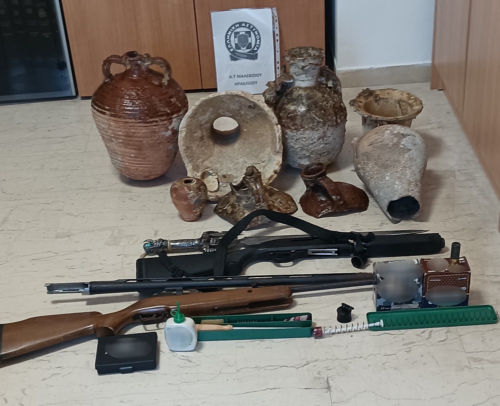 Πιο αναλυτικά, οι Αρχές βρήκαν ένα κυνηγετικό όπλο, ένα αεροβόλο, 50 σφαίρες, μία σπάθα, ένα εξάρτημα όπλου και είδη συντήρησης οπλισμού, τρεις αρχαίους αμφορείς και τμήματα αμφορέων και κεραμικά αντικείμενα.