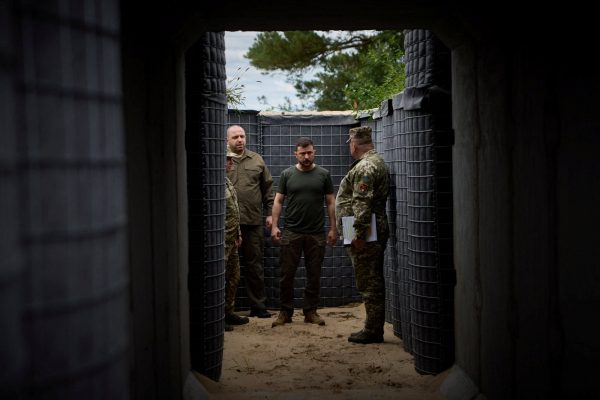 Ο Βολοντίμιρ Ζελένσκι κατά τη διάρκεια επιθεώρησης των οχυρώσεων στα σύνορα με τη Λευκορωσία.