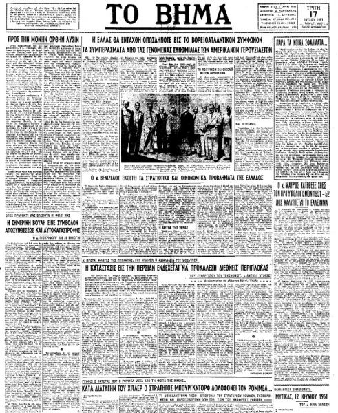 «ΤΟ ΒΗΜΑ», 17.7.1951, Ιστορικό Αρχείο «ΤΟ ΒΗΜΑ» & «ΤΑ ΝΕΑ»