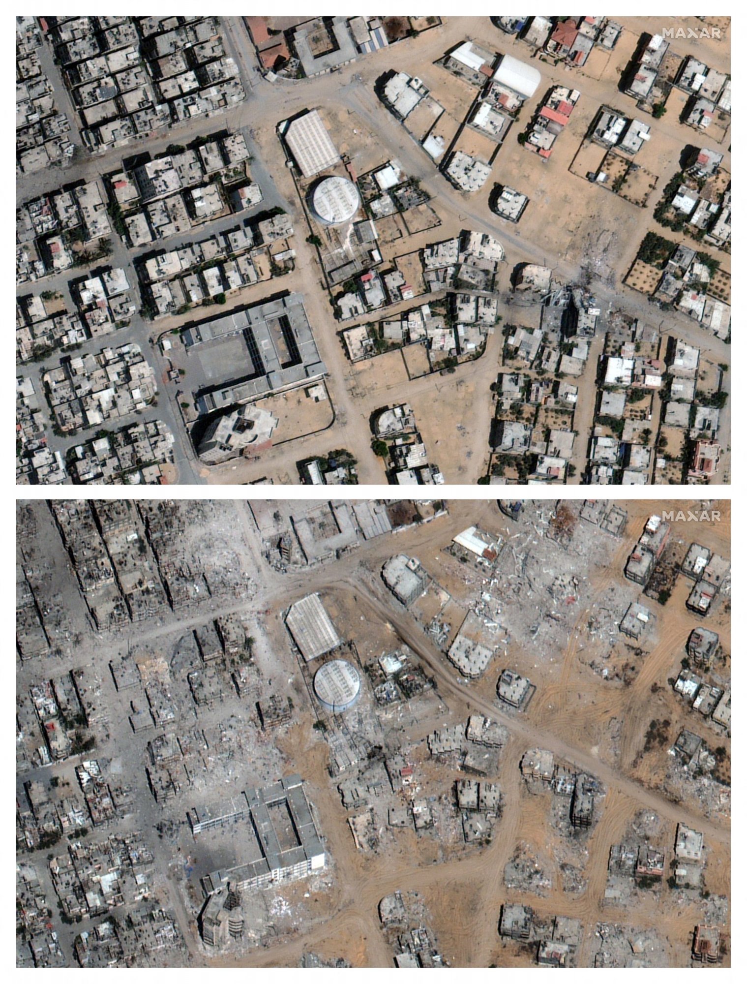 Δορυφορικές εικόνες δείχνουν την εγκατάσταση ύδρευσης Canada Well στο Τελ αλ Σουλτάν της Ράφα, πριν και μετά την καταστροφή του χώρου από έκρηξη του ισραηλινού στρατού.