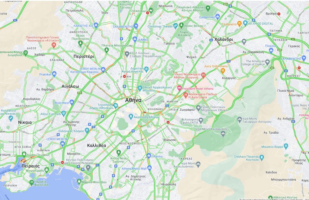 Όσοι ταξιδεύουν καλό είναι να ξεκινήσουν λίγο νωρίτερα, καθώς οι καθυστερήσεις είναι αρκετές. Παρακάτω φαίνεται ο χάρτης, ο οποίος δείχνει την κίνηση στους δρόμους του Λεκανοπεδίου Αττικής.