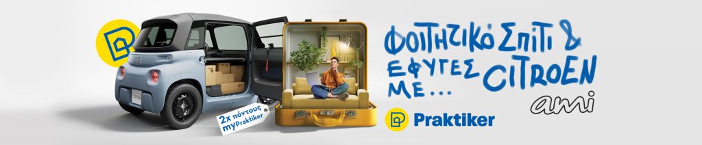 Μην χάνεις άλλο χρόνο, λοιπόν! Σύντομα ξεκινά μία από τις πιο συναρπαστικές περιόδους, η φοιτητική ζωή, την οποία περίμενες 12 χρόνια στα θρανία. Και αν θέλεις αυτό το ξεκίνημα να είναι δυναμικό, πραγματοποίησε μία επίσκεψη σε ένα από τα 17 καταστήματα Praktiker ή μπες απλώς στο praktiker.gr. Εκεί θα ανακαλύψεις τα key-items για να αποκτήσεις το φοιτητικό σπίτι που σου ταιριάζει, ενώ θα τα αποκτησεις με τον τρόπο πληρωμής που σε βολεύει καλύτερα, με πιστωτική κάρτα και αποπληρωμή έως 60 δόσεις άτοκα ή με χρηματοδότηση μέσω του προγράμματος «Δ-όση θέλεις». Όπως και να έχει, αν οι αγορές σου ξεπεράσουν τα 199 ευρώ, θα μπεις αυτόματα στην κλήρωση για ένα όχημα πόλης Citroën Ami, το οποίο θα σε συντροφεύει στις φοιτητικές σου περιπέτειες.