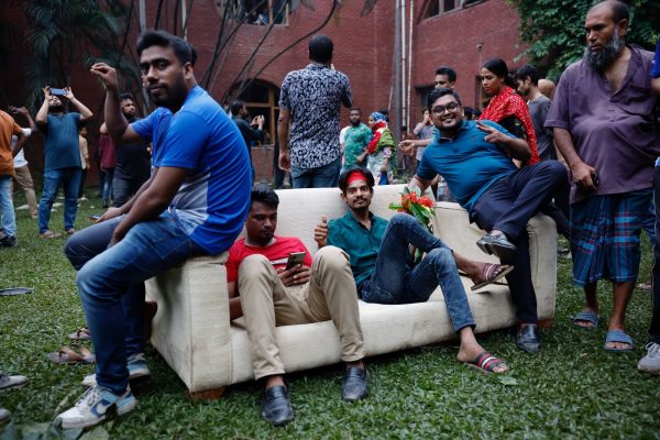 Διαδηλωτές…χαίρονται τον καναπέ της παραιτηθείσας πρωθυπουργού Σέιχ Μεσίνα, μετά την φυγή της για την Ινδία και έπειτα για το Λονδίνο.