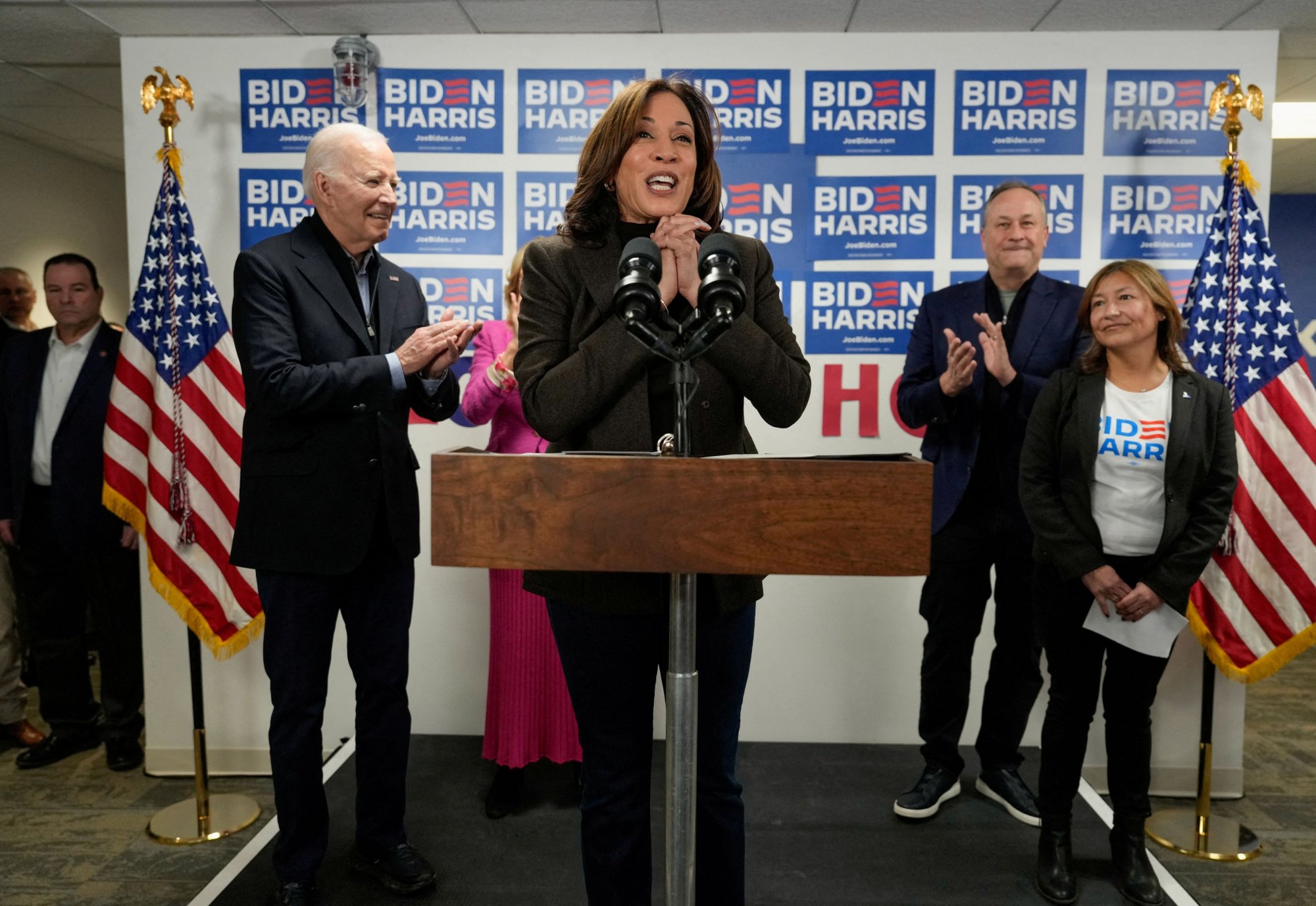 Η επικεφαλής της προεκλογικής εκστρατείας της Κάμαλα Χάρις, Τζούλι Τσάβες Ροντρίγκες, βγαίνει από τα παρασκήνια του κομματικού «στρατηγείου» στο Γουίλμινγκτον του Ντέλαγουεαρ (Erin Schaff/Pool via REUTERS)