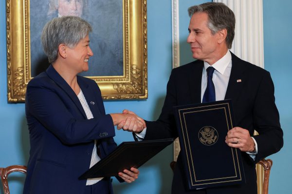 Η υπουργός Εξωτερικών της Αυστραλίας Πένι Γουόνγκ και ο υπουργός Εξωτερικών των ΗΠΑ Άντονι Μπλίνκεν ανταλλάσσουν χειραψία κατά τη διάρκεια των υπουργικών διαβουλεύσεων Αυστραλίας-ΗΠΑ.