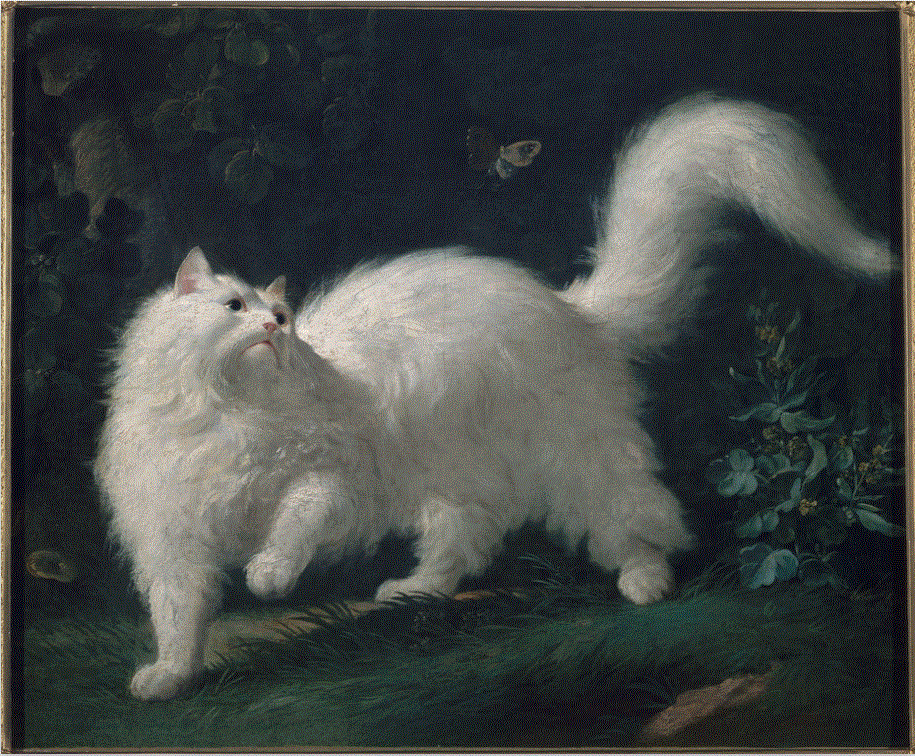 Αυτή η πανέμορφη λευκή Αγκύρας ζωγραφισμένη από τον Jean-Jacques Bachelier διακόπτεται στη μέση του περιπάτου της από μια άτυχη πεταλούδα- η γάτα, ως κυρίαρχος αυτού του γκαζόν, σταματά και παγώνει, με την πατούσα της στον αέρα, όπως κάποιος θα σήκωνε το μικρό του δάχτυλο κρατώντας ένα φλιτζάνι τσάι. Οι αρμονικές καμπύλες της στρογγυλεμένης πλάτης του αιλουροειδούς, η πλουμιστή ουρά και το γυαλιστερό τρίχωμα της γάτας μαγνητίζουν το βλέμα. Το κυνήγι της πεταλούδας, την οποία μόλις και μετά βίας βλέπουμε στο σκοτεινό φόντο, είναι απλώς μια αφορμή για τον ζωγράφο να αναδείξει τη χάρη και την κομψότητα αυτής της πολυτελούς γάτας.