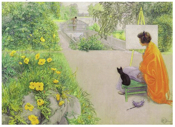 Η «Γέφυρα» του Carl Olof Larsson ζωγραφίστηκε με ακουαρέλες αντί για τα παραδοσιακά λάδια. Ο πίνακας απεικονίζει μια γυναίκα ζωγράφο και τη γάτα της, καθώς παρακολουθούν έναν άνδρα σε μια γέφυρα, ο οποίος κατά λάθος μπήκε στη μέση της εικόνας που σκόπευε να ζωγραφίσει η γυναίκα. Με τα φωτεινά χρώματα και τη δροσερή πρωινή αίσθηση του πίνακα, πρόκειται για μια γραφική, ευχάριστη σκηνή από μόνη της. Η προσθήκη της γάτας απλά κάνει το σκηνικό ακόμα πιο φευγαλέο.