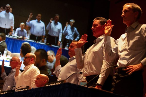 Μάρτυρες ορκίζονται κατά την ακρόαση του Εθνικού Συμβουλίου Ασφάλειας Μεταφορών (NTSB) για το ατύχημα με την πόρτα του Boeing 737 MAX της Alaska Airlines στα κεντρικά γραφεία του NTSB στην Ουάσινγκτον, ΗΠΑ, 7 Αυγούστου 2024.